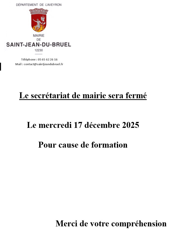 Suite à la fermeture provisoire du bureau de poste de St-Jean du Bruel, les objets recommandés ou colis remis contre signature, non distribués, seront déposés en Mairie à compter du lundi 4 août 2025, afin d’éviter aux usagers de se rendre à la Poste de la Cavalerie. Ils pourront être retirés à l’accueil de la […]